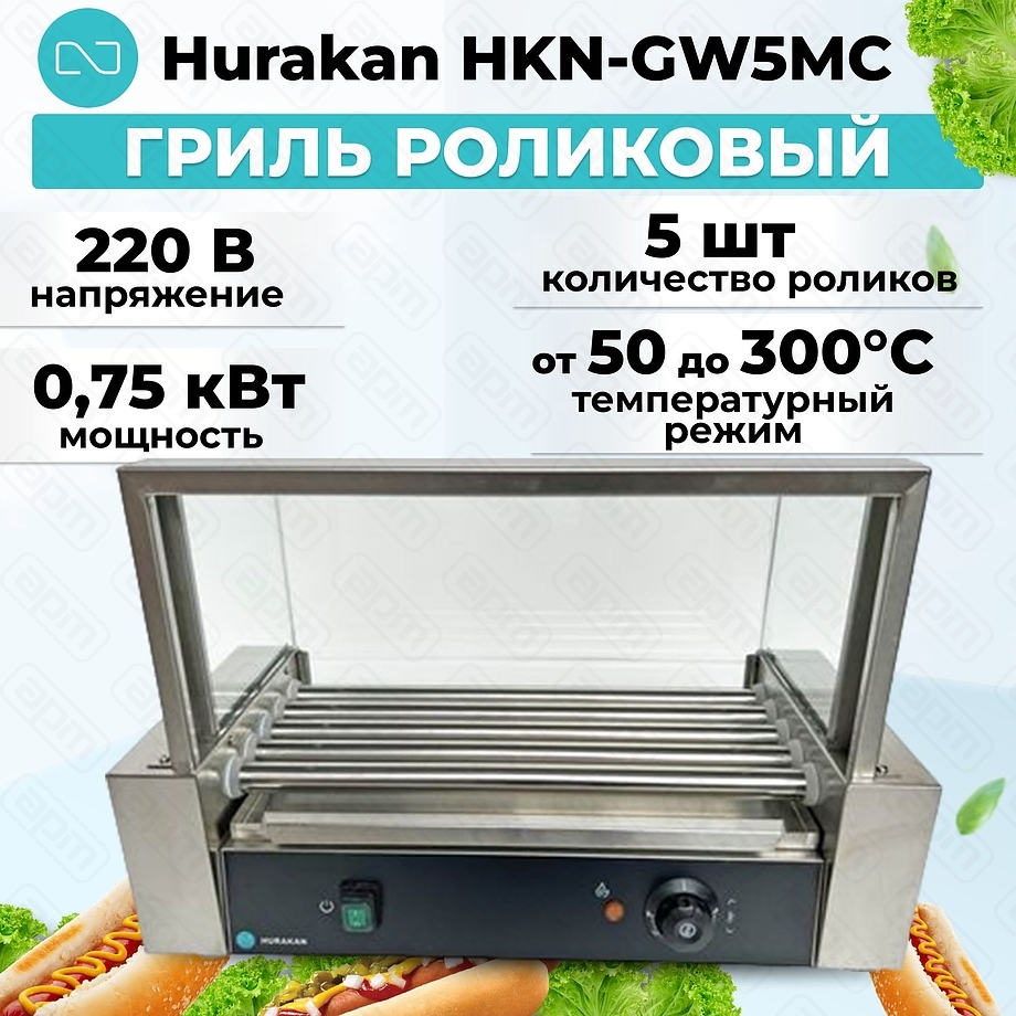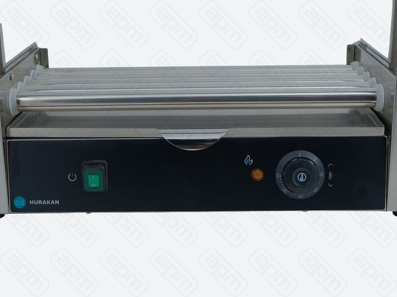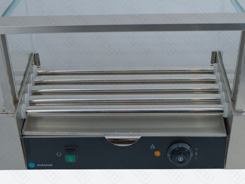ГРИЛЬ ДЛЯ HOT DOG HURAKAN HKN-GW5MC С ЭКРАНОМ — компактный гриль, разработанный специально для приготовления и хранения в горячем виде колбасных изделий и мясных полуфабрикатов цилиндрической формы. Подходит для использования в небольших ресторанах, уличных фастфудах, передвижных точках продажи еды и автозаправочных станциях.