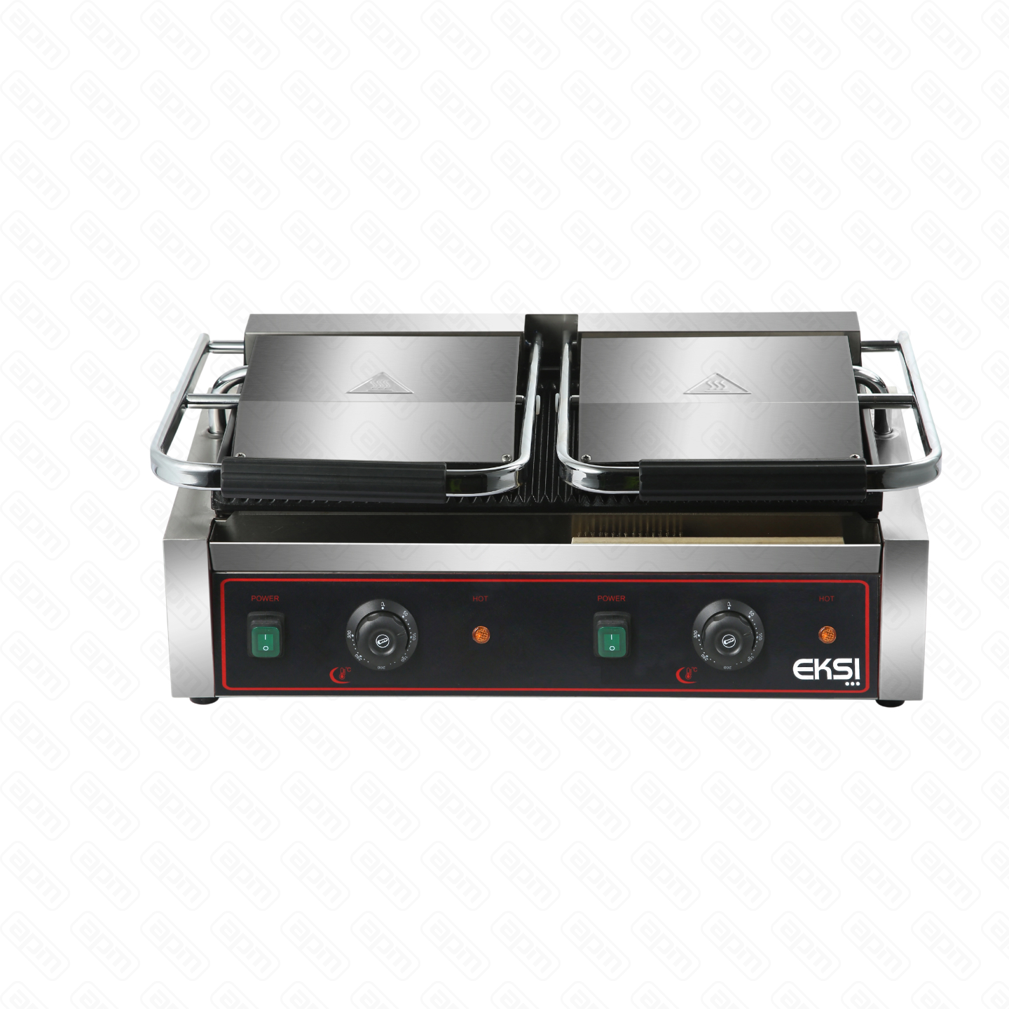Гриль контактный т.м. EKSI серии HEG, мод. HEG-813-MT, у первой половины верхняя и нижняя части рифленые, у второй половины - плоские, 580х400х210 мм, 3600 Вт, 220 В, 50°C-300°C, размер верхих рабочих поверхностей 214х214 мм, размер нижней рабочей поверхности 480х228мм, корпус - нержавеющая сталь