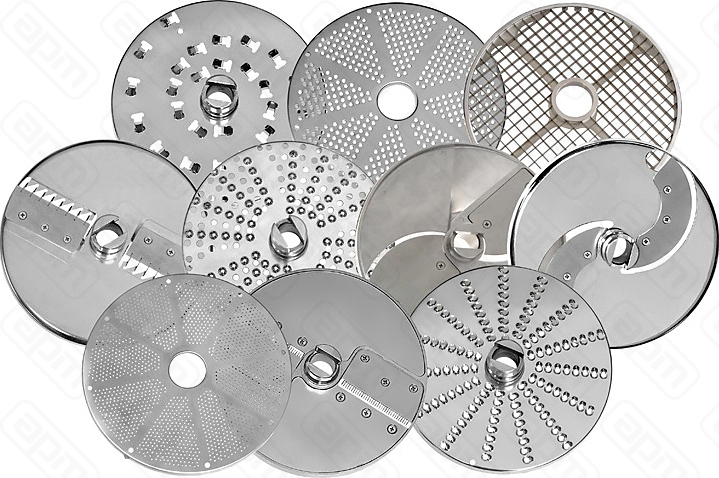 – Основные режущие элементы: шинковочный диск, диск для драников, комбинированный нож, нож для корейского салата, терочный диск, дисковые ножи (2 мм и 10 мм), решётки ножевые.