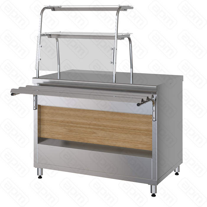 Прилавок нейтральный с полками ПНП11 линии раздачи питания "ШЕФ" 1120. Изделие предназначено для кратковременного хранения и раздачи потребителю хлебобулочных и кондитерских изделий, а также для установки на столешнице нижнего модуля термостатов с напитками. Прилавок используется на предприятиях общественного питания самостоятельно или в составе технологических линий раздачи. Изделие предназначено для эксплуатации в помещениях с искусственно регулируемыми климатическими условиями.