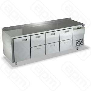 — Борт высотой 50 мм — Столешница и корпус из нержавеющей стали марки AISI 430 — Задняя панель из оцинкованной стали — Полезный объем стола: 317 л — Направляющие с доводчиками (Австрия) — Нагрузка на ящик: 35 кг — Компрессор (Испания) — Петля доводчик (Польша) — Нога опорная круглая, регулировка 50 мм (Италия) — Полка решетка регулируемая по высоте с шагом - 45 мм, гастронормированная, нагрузка: 35 кг