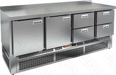 Конструкция стола включает в себя стальную столешницу, четырехсекционную холодильную камеру.