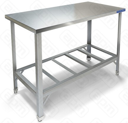 — Стол производственный без борта, столешница из нержавеющей стали марки AISI 430 толщиной 0,8 мм — ЛДСП толщиной 32 мм — Каркас разборный из трубы 40х40 нержавеющей стали марки AISI 430 толщиной 1,2 мм — Полка-решетка из нержавеющей стали марки AISI 430 толщиной 0,8 мм — Регулируемые опоры — Стол поставляется в разобранном виде