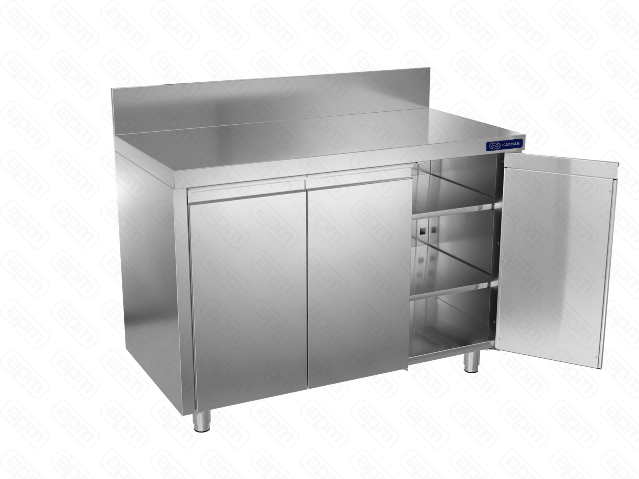 1400х600х870мм, 1 борт, высота борта 150мм, нагрузка на столешницу 100кг, нагрузка на полку 30кг. Столешница нерж. сталь AISI430 0,8мм, подложка столешницы ДСП 16мм. 3 распашные двери. Двери, боковые панели и столешница выполнены из нержавеющей стали AISI430. Дно и задняя стенка выполнены из оцинкованной стали. В комплект стола входит полка, усиленная ребром жесткости. Наличие полки позволяет увеличить полезное пространство в столе размещая на ней посуду, инвентарь, столовые приборы и сухие виды продуктов. Регулируемые ножки 20мм. Вес 85кг.