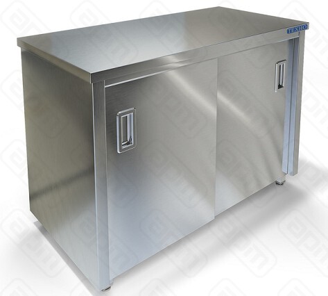 — Стол-тумба без борта — Столешница из нержавеющей стали марки AISI 430 толщиной 0,8 мм — ЛДСП толщиной 32 мм — Корпус и две двери-купе из нержавеющей стали марки AISI 430 толщиной 0,8 мм — Полка из нержавеющей стали марки AISI 430 толщиной 0,8 мм — Задняя стенка из нержавеющей стали марки AISI 430 толщиной 0,5 мм — Регулируемые опоры — Стол поставляется в собранном виде